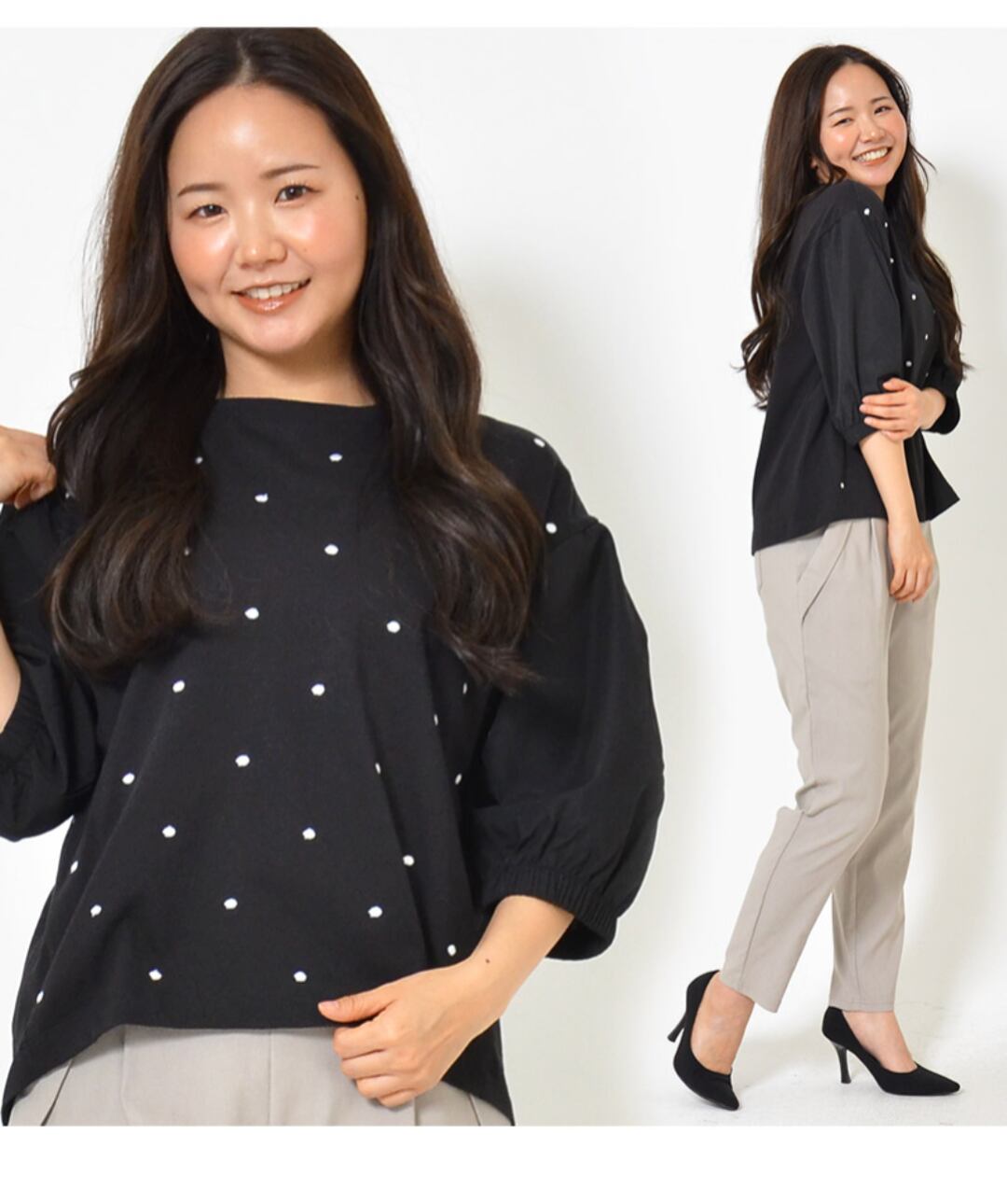 ドット柄刺しゅうで高見えする袖切替プルオーバーです。身頃と袖を異素材で切り替えて、アクセントに!