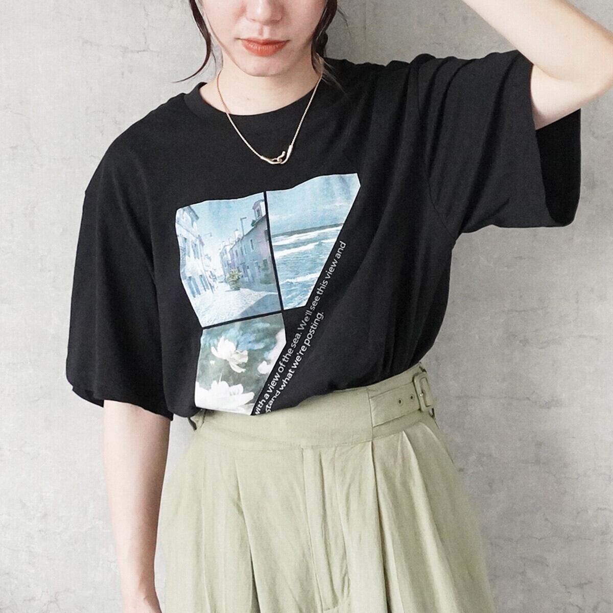 コマ割りフォトプリントやわらかTシャツ◆ブラック
