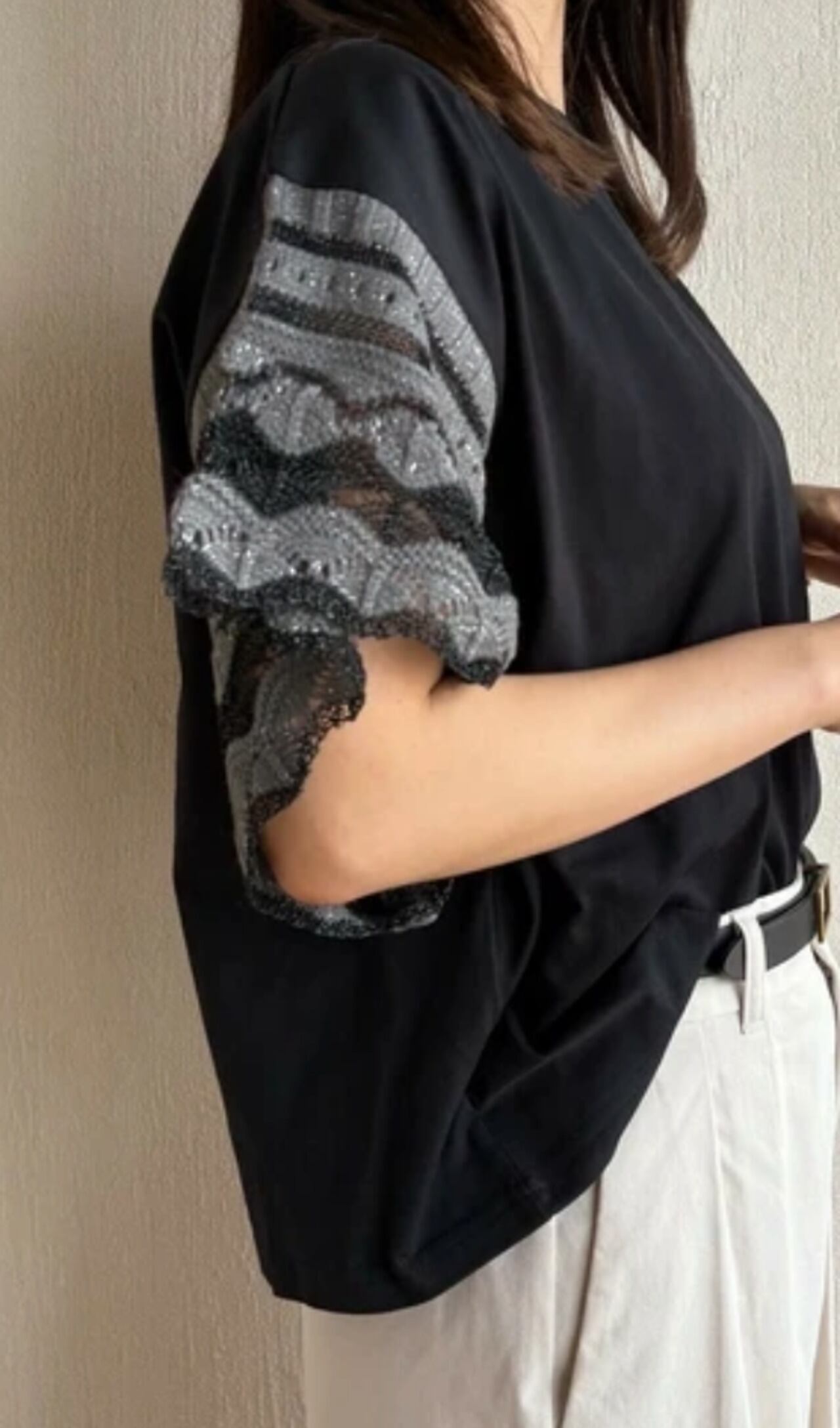 透かし編みスリーブTシャツ◆ブラック◆レディース