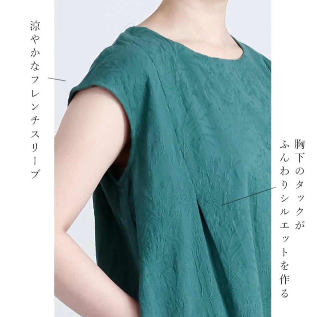 袖は、涼やかなフレンチスリーブ仕立て。ボディラインを拾いすぎないつくりで、華奢見えしながらさりげなく気になるところをカバーしてくれるAラインシルエットになっています。両脇には便利なスラッシュポケット付。