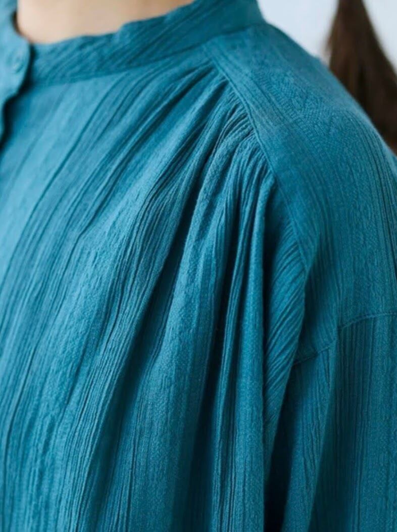コットンクレープにフラワーモチーフのジャカード織りを施し、表面感のある素材にギャザーをたっぷりと入れた身頃がゆったりシルエットを演出し、体型カバーにも最適。