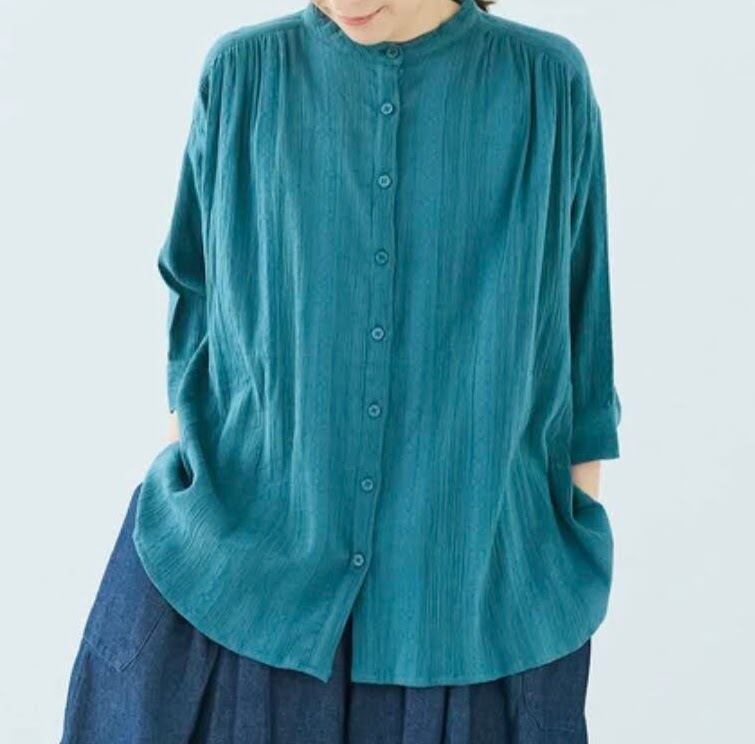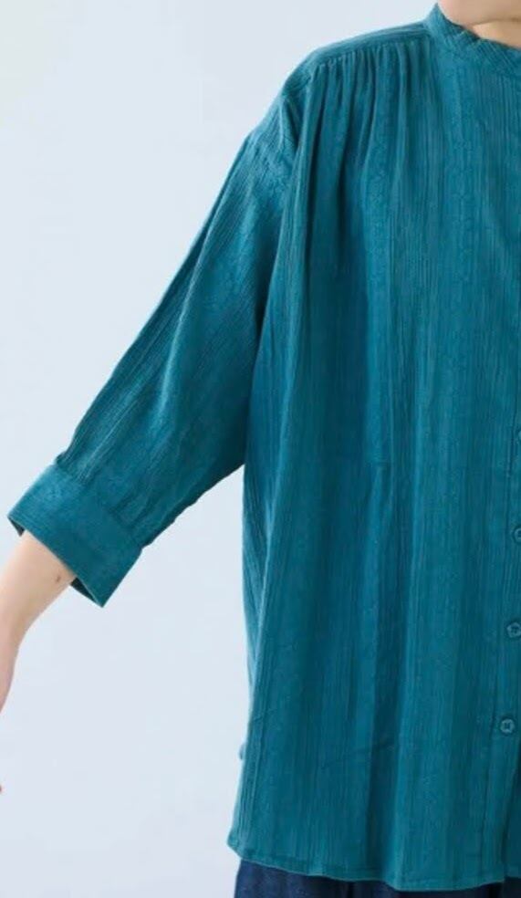7分袖ジャカードブラウス◆前開き、花柄、ナチュラルクレープ素材◆ブルーグリーン