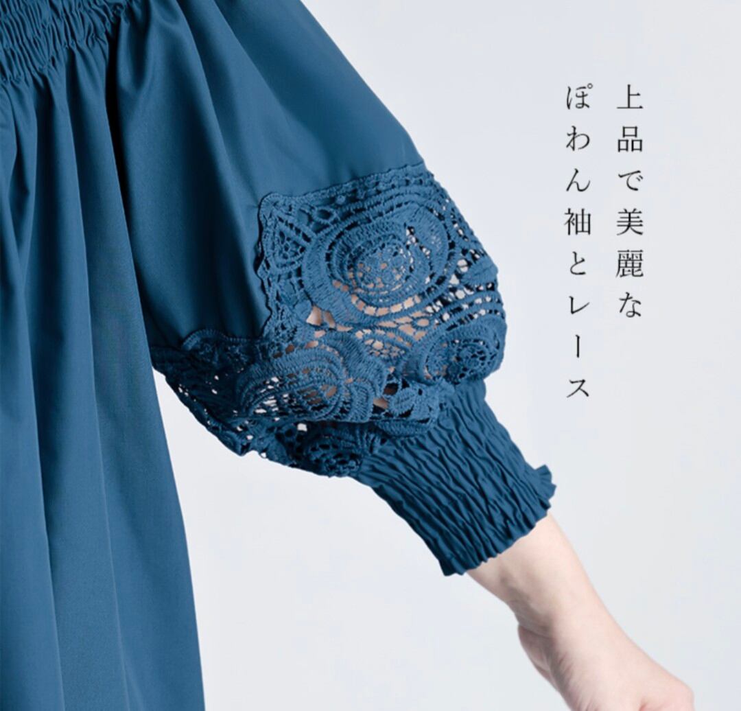 ≪衿元のシャーリング仕様x多釦デザイン&袖レース使いがポイント!ゆったり身幅でお洒落に体型カバー!≫