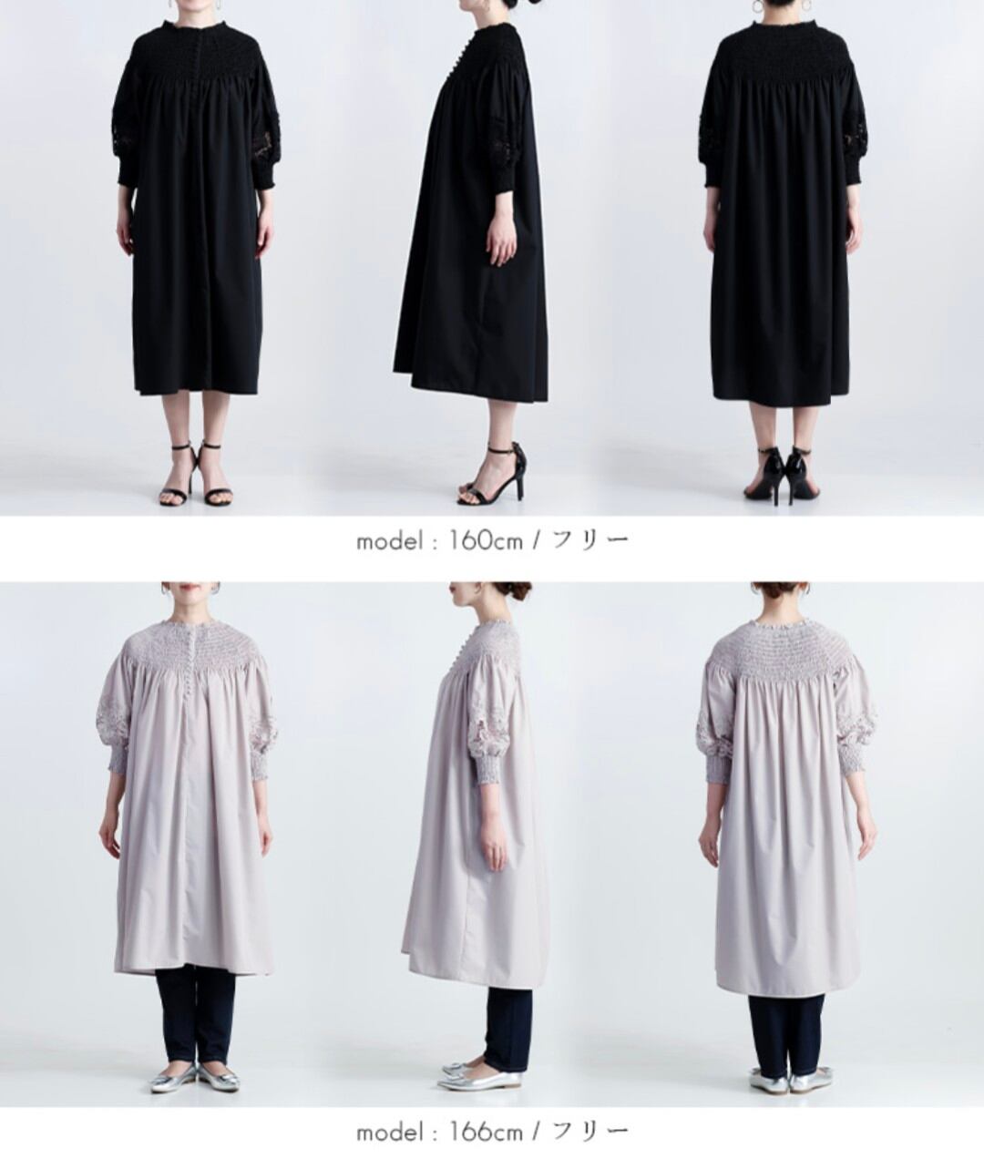 1枚着るだけで上品にこなれる、多釦xシャーリングxレース使いのデザインが優美な大人ワンピース。カジュアルシーンからお出かけまで幅広く大活躍!