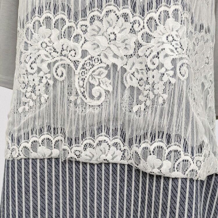無地のカットソー、レース、ストライプ柄布帛の異素材を切り替えた半袖チュニック。
