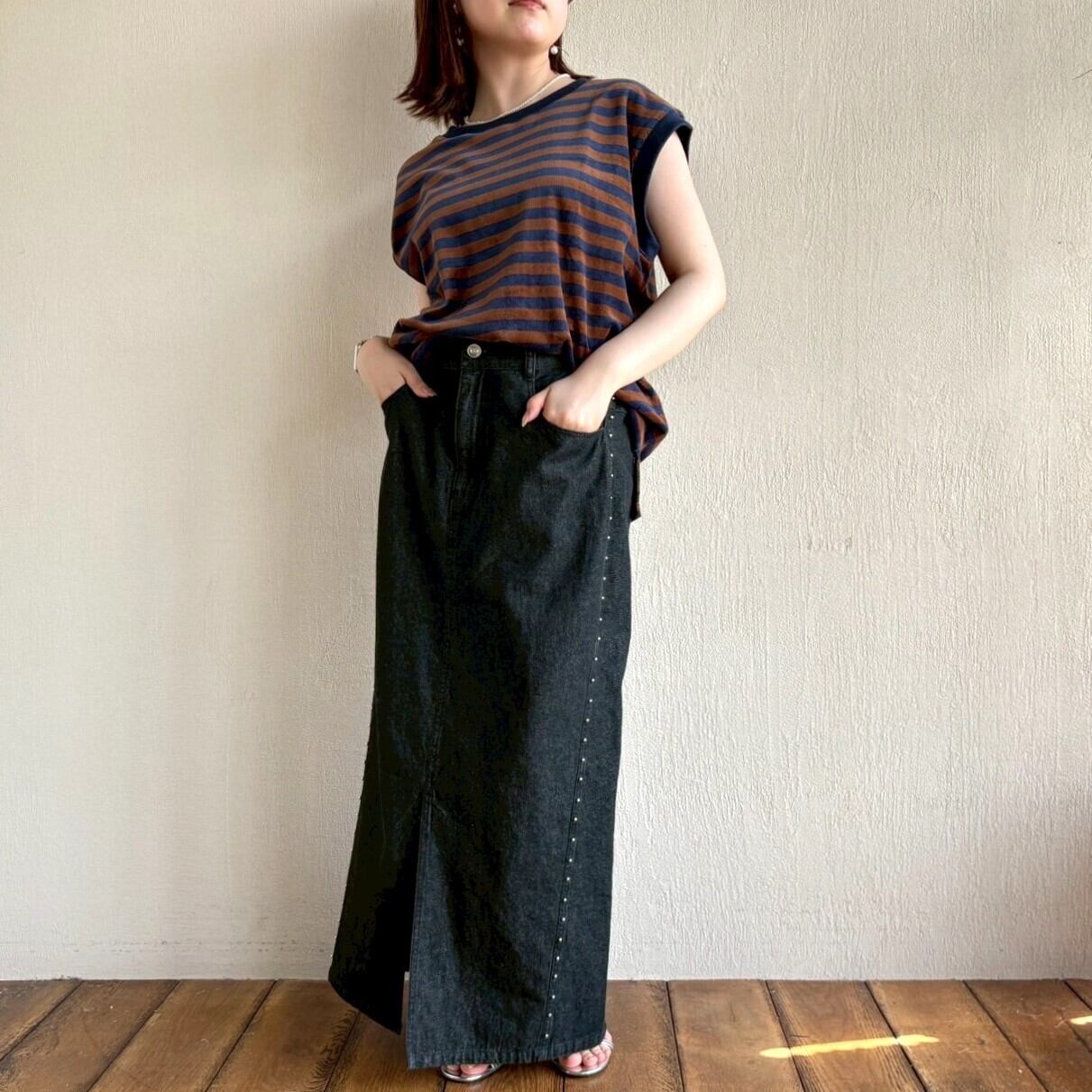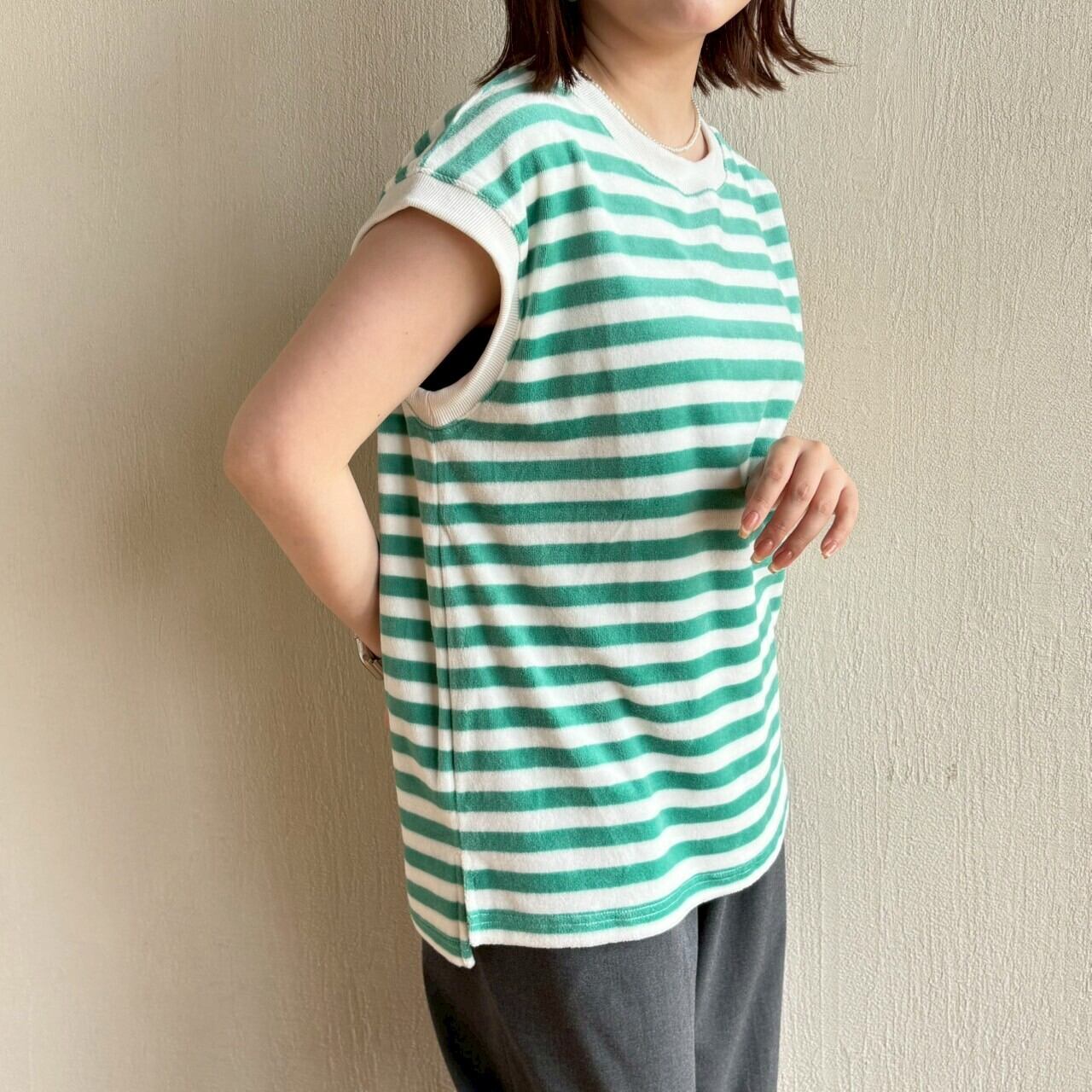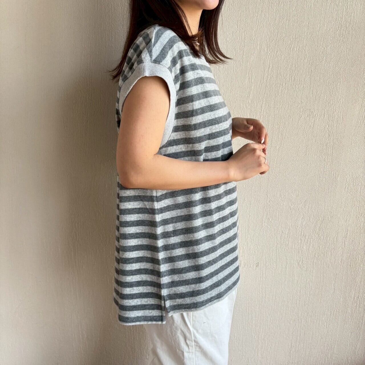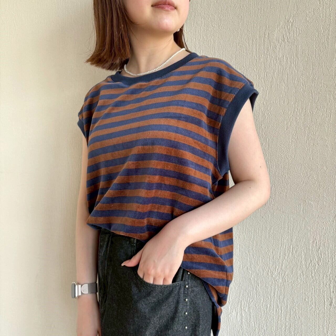 ベロアボーダーのノースリーブプルオーバー。ゆったりシルエットで楽にご着用頂けます。季節の変わり目におすすめの一枚です。