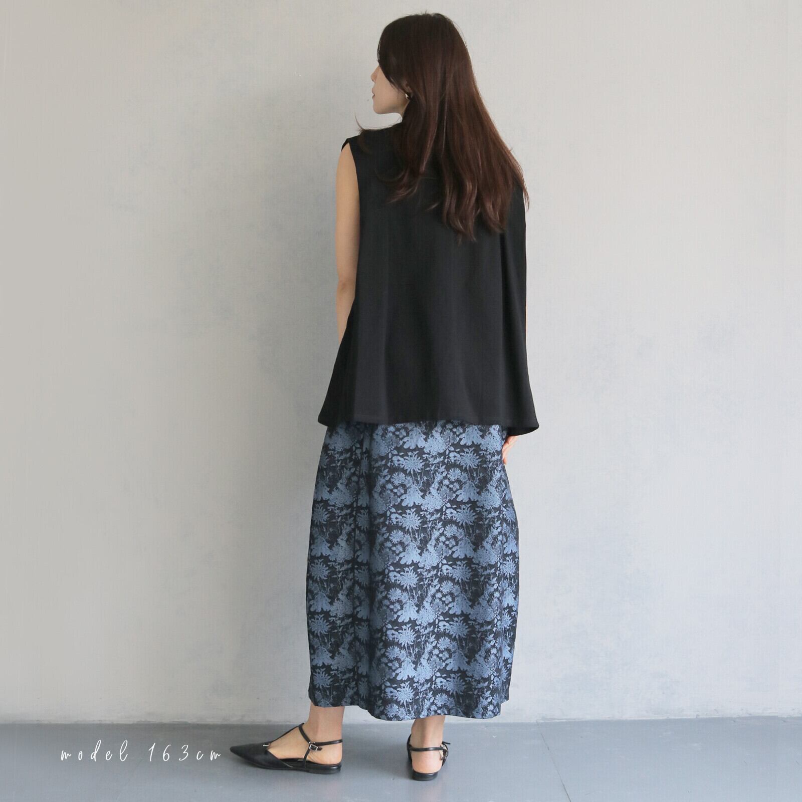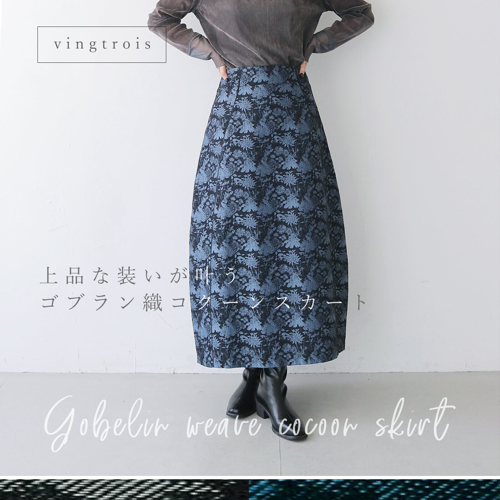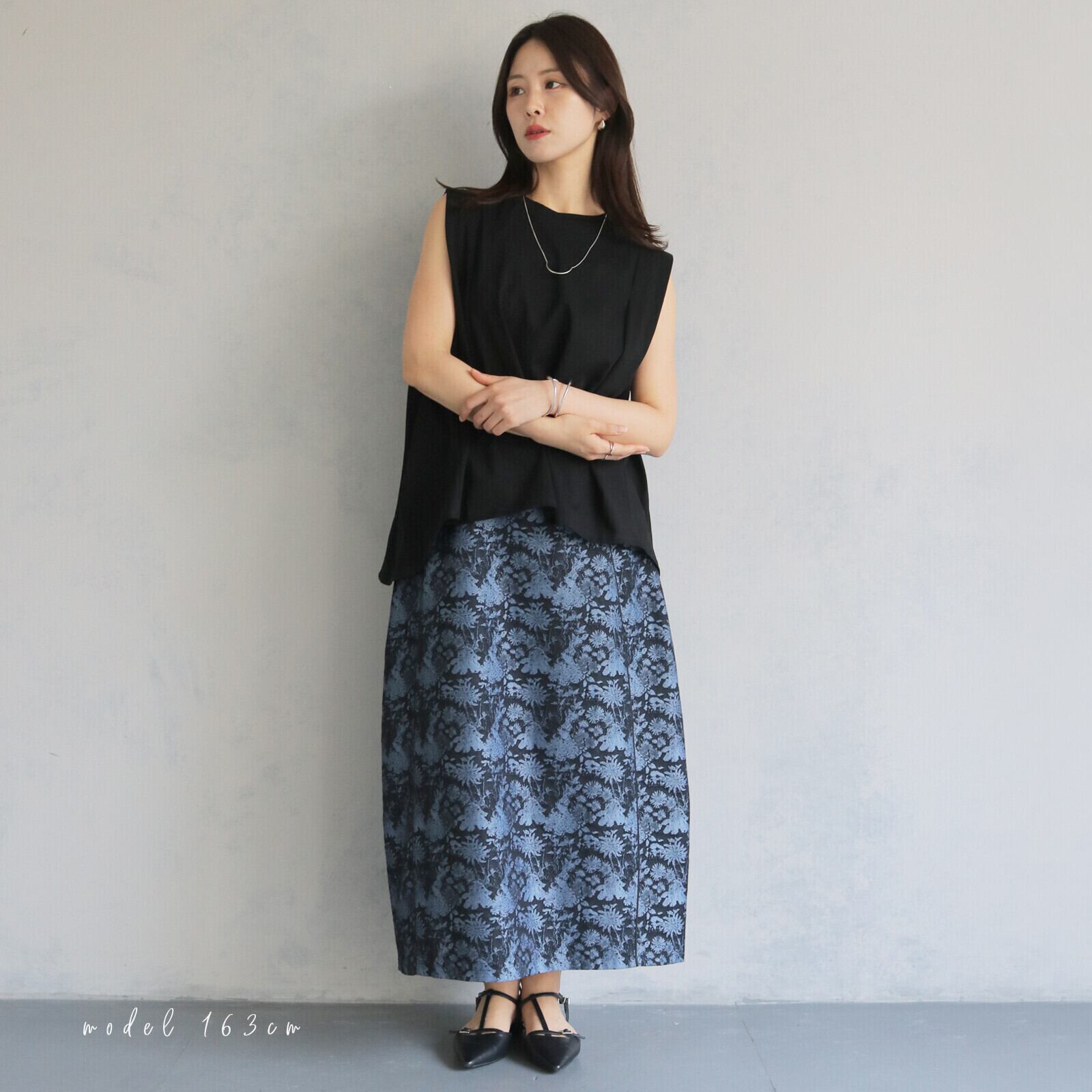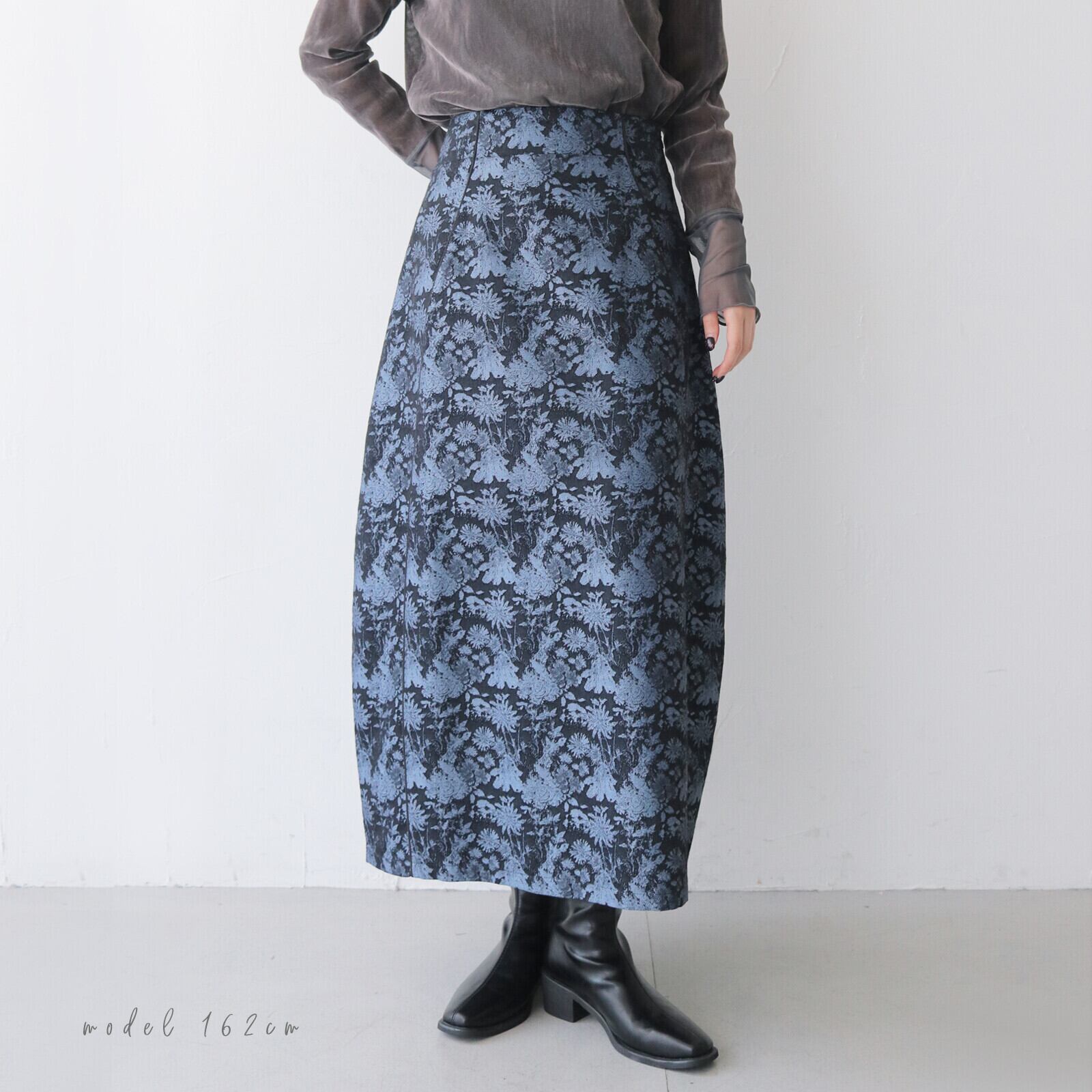 高級感のあるゴブラン生地を使用した主役級のロングスカート。コクーンシルエットで立体感があるので体のラインを綺麗に見せてくれます。