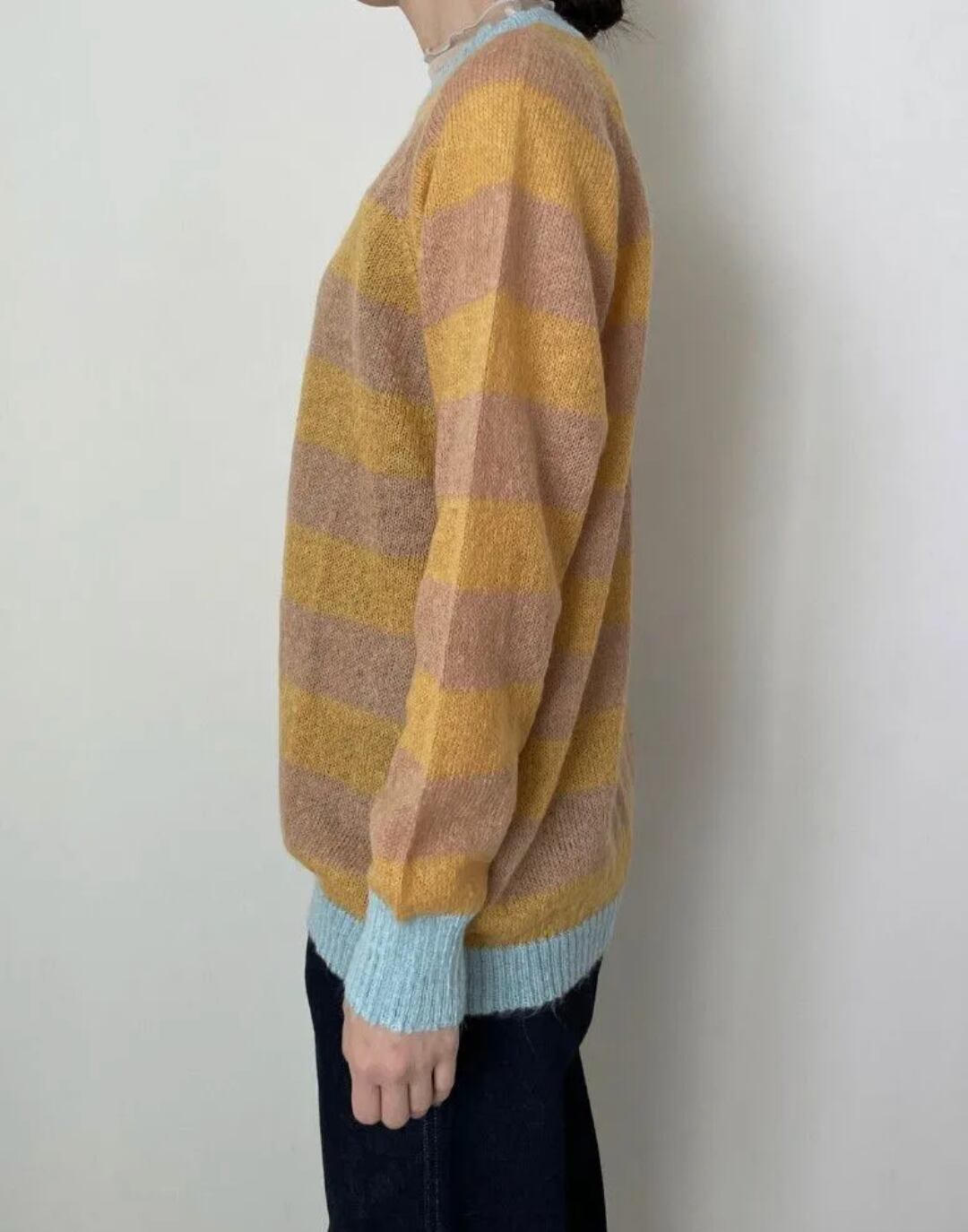 モヘヤが入った生地で、柔らかくフワッとした質感が見た目にも季節感と存在感を放ちます。軽いので楽に着ていただけ、ボリュームが出にくいのでどんなボトムスでも相性抜群。角度によって程よく透け、春先や秋は1枚で使いやすいです。
